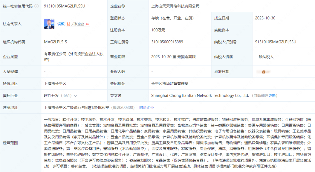 企查查信息表明,今年10月,上海宠天天网络科技有限公司成立,侯毅担任法定代表人,由上海派特鲜生网络科技有限公司全资持股,经营范围涵盖互联网销售、宠物食品及用品批发零售等。同时,派特鲜生申请的“宠天天FresDD”商标正在注册中。