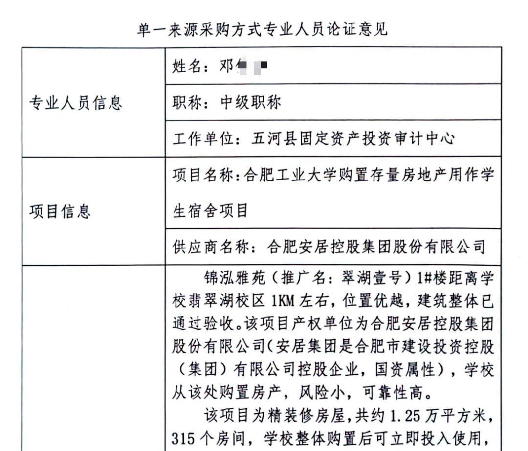 翠湖壹号由龙湖集团开发建设,主体建筑已验收,与合肥工业大学翡翠湖校区仅隔两条马路。1号楼是保障性租赁住房,有315个精装修房间,学校整栋购置后可立即投入使用。该负责人介绍,目前处于单一来源采购公示阶段,后续还有挂网、投标等流程。