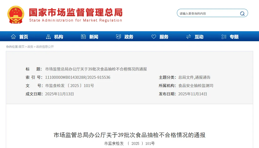 近期,市场监管总局组织食品安全监督抽检 2127 批次样品,检出 39 批次样品不合格。