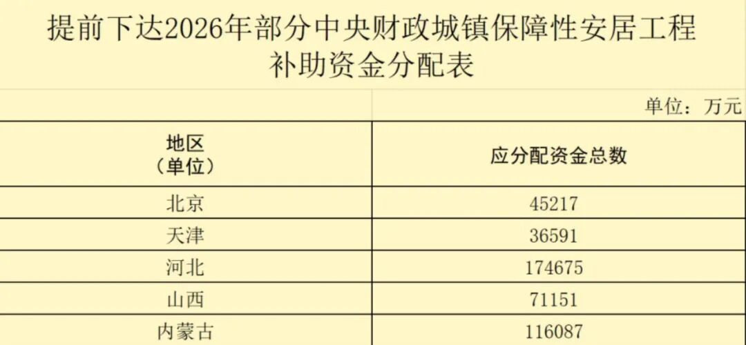 近日,财政部向各省、自治区、直辖市等财政部门及新疆生产建设兵团财政局,提前下达2026年部分中央财政城镇保障性安居工程补助资金。