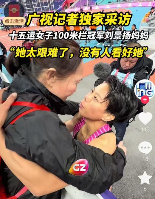 北京时间11月19日,全运会女子100米栏决赛中,广东选手刘景扬以12秒81的成绩夺冠,四川名将吴艳妮以12秒85获得亚军。赛后,当地媒体在看台上采访到刘景扬的母亲,她母亲激动地表示:“她做到了,但她很不容易啊,你知道她经历了多少吗?她都没有教练了,她太难了,人家都不看好她。”