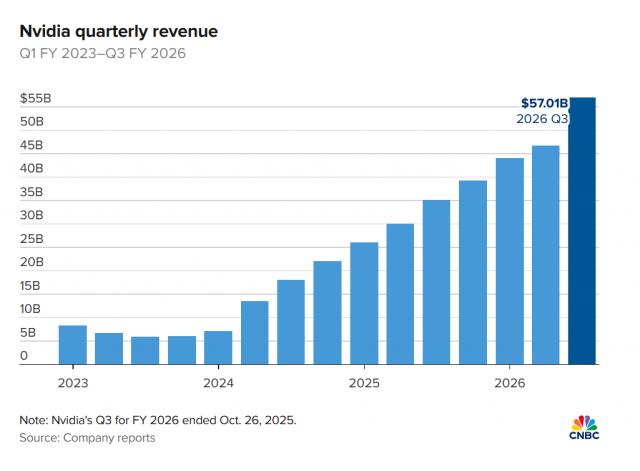 IT之家11月20日消息,英伟达(NVIDIA)于今日(11月20日)发布了2026财年第3财季(截至10月26日)财报,各项数据均创下历史新高。财报显示,公司该季度实现创纪录营收570亿美元,较去年同期的350.8亿美元大幅增长62%,相比上一季度的467.4亿美元也增长了22%。