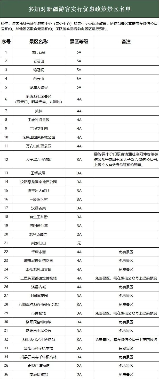 ● 新疆全域普惠共享:新疆其他地区游客可享受21家收费景区门票半价优惠,洛阳博物馆、洛邑古城等15家免费景区也同步开放。