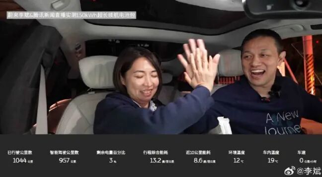 2023年底,蔚来发布150度半固态电池遭质疑,李斌进行14小时自驾直播测试续航。他和蔚来能源负责人一路交流,展现了坦诚,赢得好感。