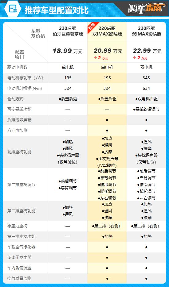 推荐车型为后驱双IMAX影院版,售价20.99万元,比后驱伯牙巨幕奢享版贵2万元,但舒适性配置提升显著,如方向盘加热、前排及第二排座椅按摩、第二排右侧零重力座椅以及第三排座椅加热功能等。此外,后排液晶屏幕、车载空气净化器、车内香氛装置以及空气质量监测等也是加分项。对于主打家用的大型SUV来说,这些配置能有效提升用车体验,非常值得推荐。