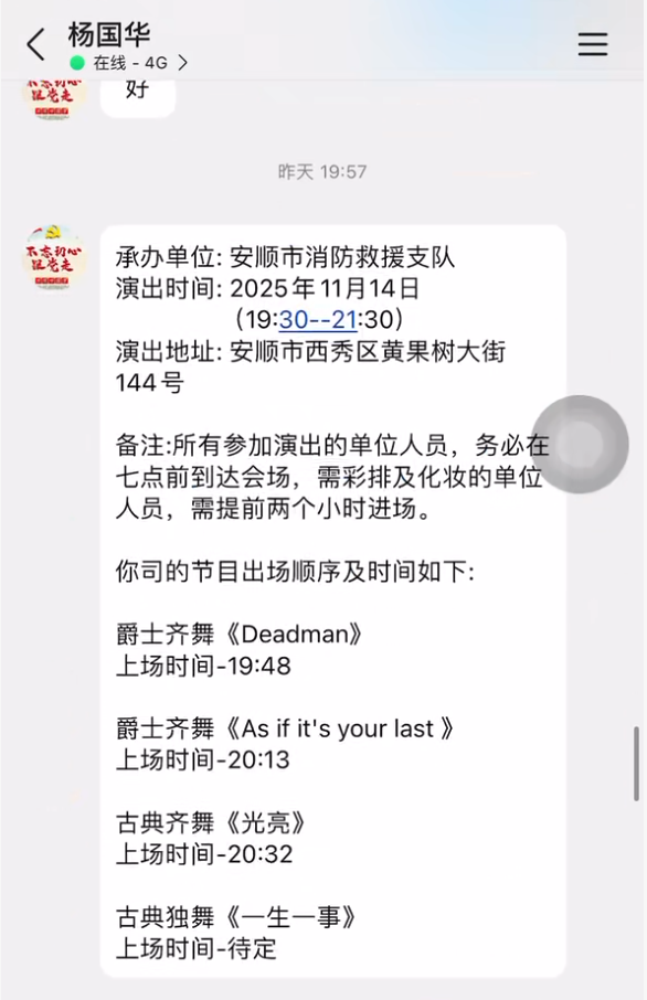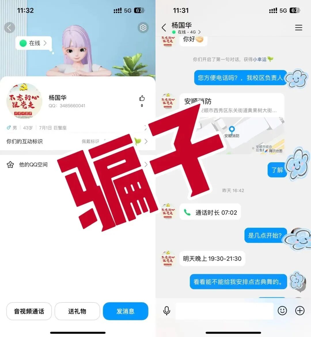 近日,安顺一家舞蹈机构的QQ账号收到“杨国华”发来的合作信息。对方称自己刚调到消防支队,负责13号晚上的联谊舞会,邀请舞蹈机构参加活动并布置场地。舞蹈机构负责人曾女士询问其联系方式时,对方以“单位不准外泄电话”“有保密规定,其他具体内容不方便说”为由拒绝告知。