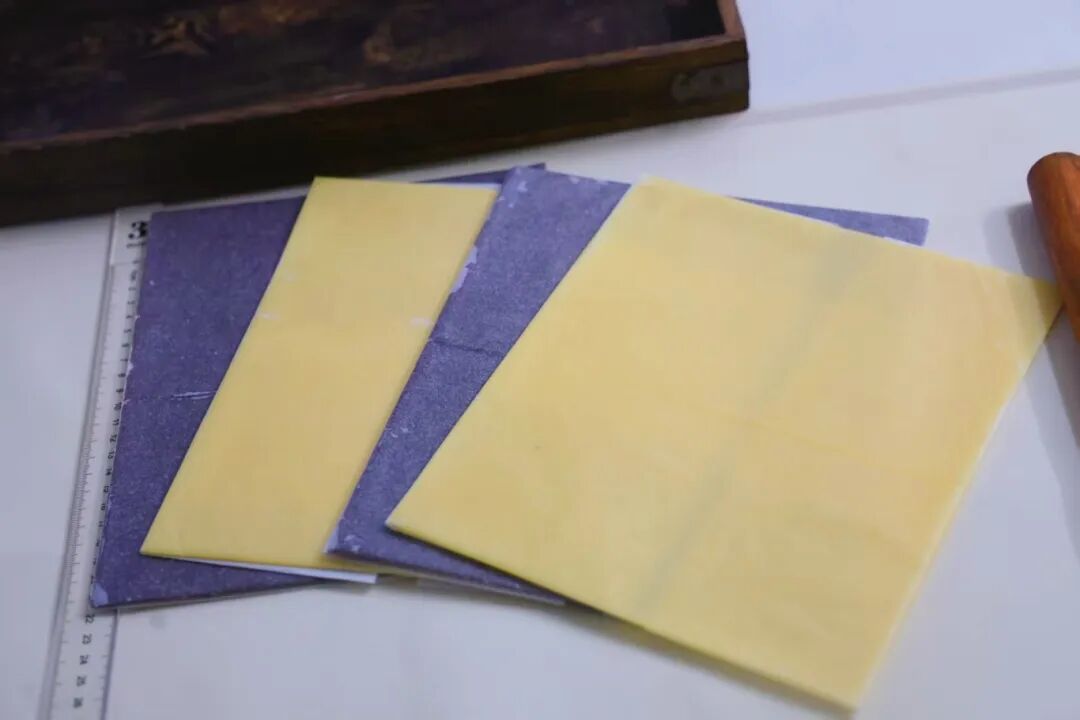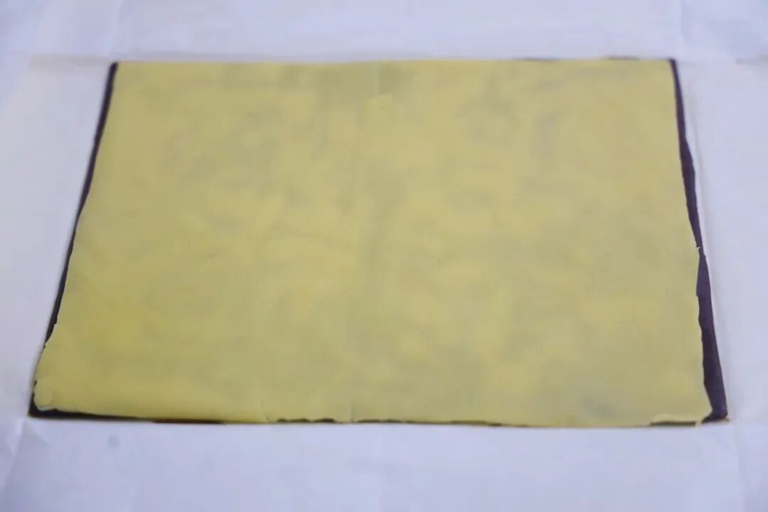 7. 用擀面杖将面团擀开擀薄,原色擀成长宽24×20厘米;可可面团擀成长宽24.5×20厘米。