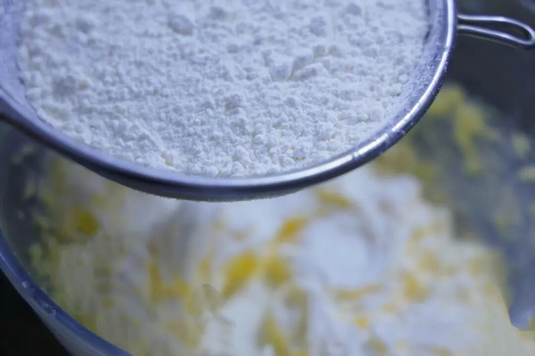 3. 分两次加入全蛋液,同时将低筋面粉过筛。