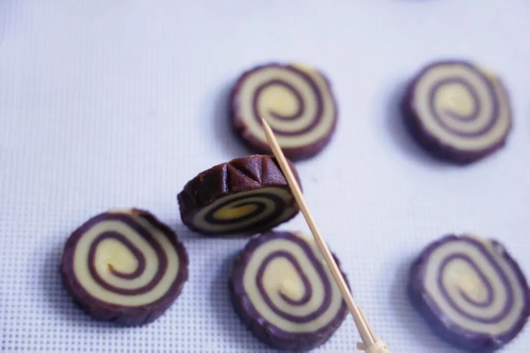 10. 把冷冻好的面团均匀切分,用牙签在外圈压出纹路。
