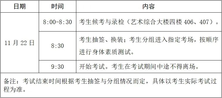 本次考试由四部分内容组成,分别是身体素质测试(分值150分)、乐感能力测试(分值20分)、表演能力测试(分值80分)以及语言表达能力测试(分值50分),没有理论考试环节。考试满分为300分,成绩按实际得分计入总分。