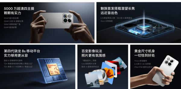 在影像方面,魅族 22 后置三摄组合,包括 5000 万像素主摄、5000 万像素超广角镜头及 5000 万像素潜望长焦镜头,主摄和长焦均支持 OIS 光学防抖,122 ° 超广角可覆盖更多拍摄场景,适合大场景创作;潜望长焦镜头能满足远景和人像拍摄需求。该机前置 5000 万像素自拍镜头,成像细腻自然,配合魅族影像算法优化,全场景拍摄表现出色。