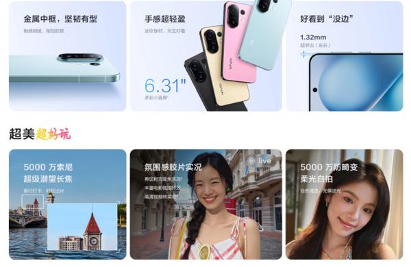 在影像系统上,vivo S30 Pro Mini 表现突出。后置 5000 万像素 1/1.56 英寸大底主摄,配合 OIS 光学防抖技术,在暗光环境下能有效控制噪点;5000 万像素潜望长焦镜头支持 3 倍光学变焦;800 万像素超广角镜头可实现 106 ° 超视野低畸变拍摄。该机前置 5000 万像素防畸变柔光自拍镜头,搭配创新的希区柯克变焦实况功能,用户按下快门并按提示移动机位,系统就能自动完成变焦,生成 3 秒动态实况照片。
