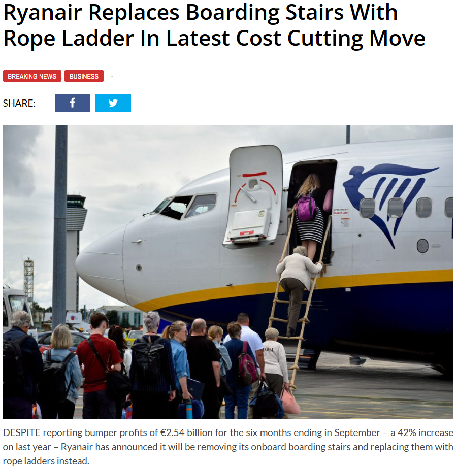 综上,网传“瑞安航空用绳梯代替传统登机梯以降低成本”的说法不实,该说法源自爱尔兰讽刺新闻网站Waterford Whispers News,属于虚构与夸张的幽默报道,并无权威信源支持。