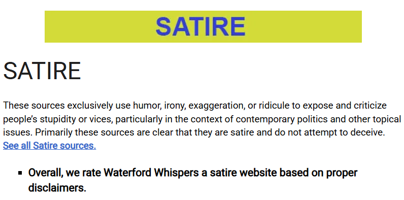 信源评估机构MBFC(Media Bias/Fact Check)评价,Waterford Whispers News不是新闻媒体,不提供事实报道,其内容以幽默、讽刺和夸张方式评论时事与政治话题。该网站也在页面注明了讽刺性质的免责声明。