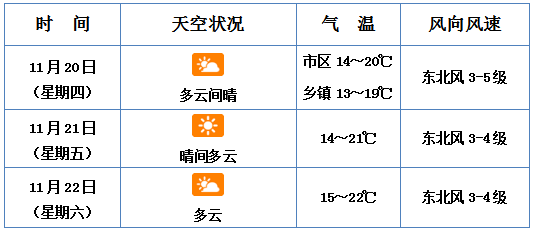 据海口市气象台消息,今天受冷空气影响,海口多云间晴,市区气温14 - 20℃,乡镇气温13 - 19℃,东北风3 - 5级,近海海面东北风5 - 6级,阵风7 - 8级;11月21日(星期五),晴间多云,气温14 - 21℃;11月22日(星期六),多云,气温15 - 22℃。