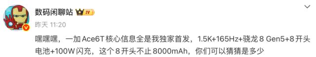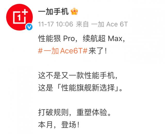 一加已确认 Ace 6T 将于本月正式发布。考虑到处理器 26 日才发布,留给一加的时间也就是最后两个工作日了。