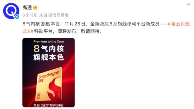 高通官微今日上午宣布,将于 11 月 26 日发布骁龙 8 系列新成员——骁龙 8 Gen 5。