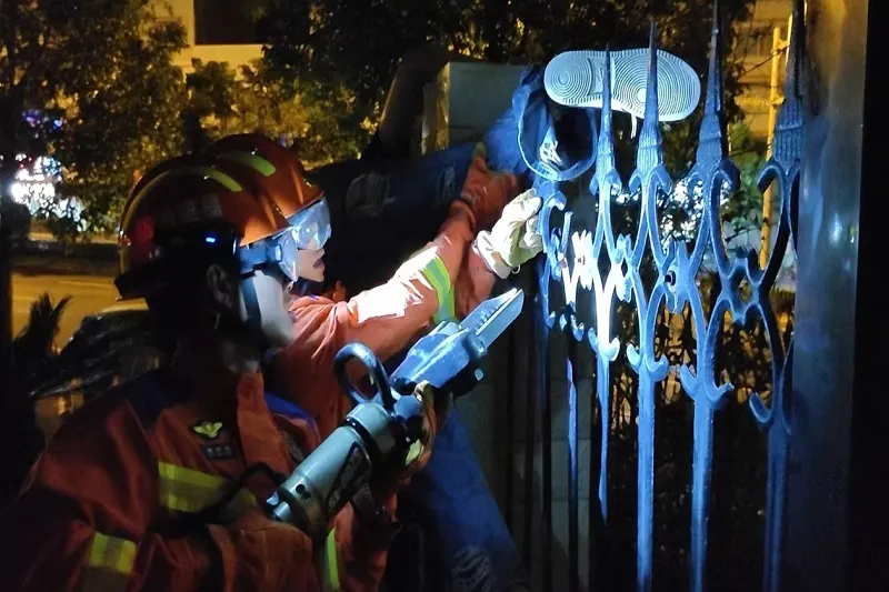 消防员用剪切钳迅速剪断了铁栅栏