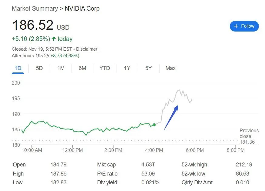 财报公布后,收涨近3%的英伟达盘后涨幅迅速扩大,盘后涨幅曾超过6%。分析师认为,英伟达提供的总营收和毛利率指引缓和了外界对AI泡沫的担忧。