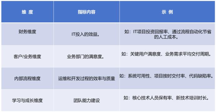 从财务、业务、流程、团队成长四个维度构建指标体系,避免唯技术论: