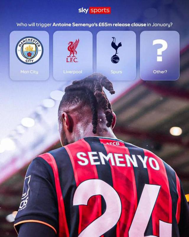 英国天空体育披露,塞门约今夏续约的5年新合同规定,违约金为6000万英镑固定金额,外加500万英镑浮动条款,总额6500万英镑,只在1月份冬窗初期的特定时段生效,以确保伯恩茅斯有时间寻找替代者。但曼联1月份签他几乎不可能,尤其是在阿莫林优先目标是中场新援的情况下。