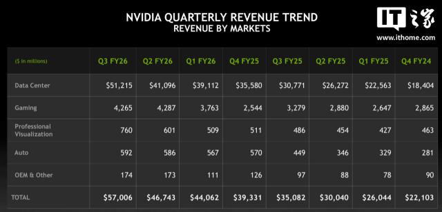 IT之家注意到,英伟达2026FYQ3财报显示,公司该季度实现创纪录营收570亿美元(IT之家注:现汇率约合4054.77亿元人民币),较去年同期的350.8亿美元(现汇率约合2495.46亿元人民币)大幅增长62%,相比上一季度的467.4亿美元(现汇率约合3324.92亿元人民币)也增长了22%。