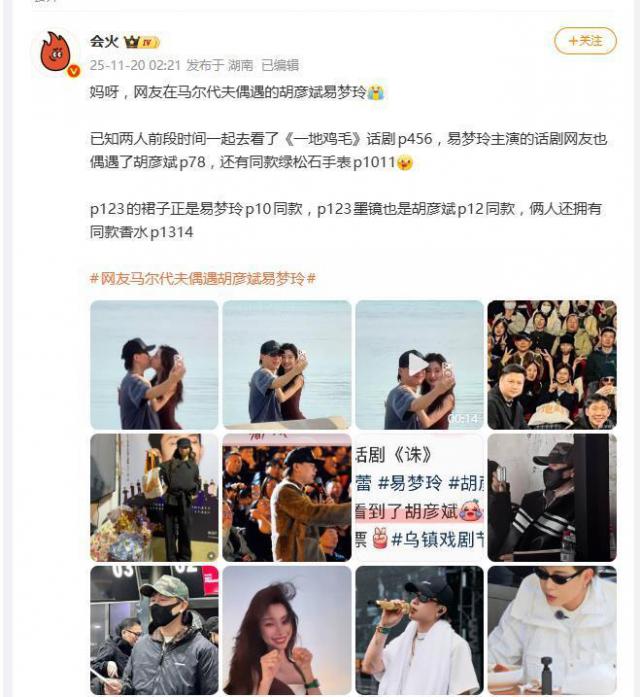 这波恋情“实锤”不断。视频中,易梦玲穿的裙子和她在抖音晒出的款式一样,两人手上戴的同款绿松石手表、同款墨镜、同款香水,被网友认定为“情侣标配”。时间线也十分吻合:11月14日张一山话剧首演,两人并肩坐在观众席,胡彦斌的穿搭与现场合照一致;10月22日易梦玲参演话剧时,胡彦斌也现身支持;9月1日,两人还一起参加了同一场结课活动。从北京到马尔代夫,短短几个月内多次“巧合”同框,很难不让人产生联想。