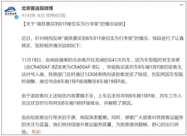11月19日,@北京客运段发布了关于“高铁票买到01F座位实为行李架”的情况说明。近期,针对网民反映“高铁票买到6车01F座位实为行李架”这一情况,北京客运段进行了仔细核实,现将相关情况说明如下:11月18日,由北京客运段值乘的北京南开往芜湖的G41次列车,因车型临时变更(从CR400AF - BZ变为CR400AF - BS),导致购买该列车6车厢1排F座的旅客无法按号入座。铁路部门及时通过12306系统向该旅客发送短信,告知其因车型临时调整,座位号由6车厢1排F座调整至6车厢19排F座。然而,该旅客对短信内容掌握不全,上车后没找到6车厢1排F座,列车工作人员发现后及时引导其到6车厢19排F座就坐,并解释了原因。北京客运段为给旅客出行带来的不便深表歉意。同时,感谢广大旅客对铁路客运服务的关注与监督,会持续提升客运服务质量,为旅客提供顺畅、舒心的出行体验。