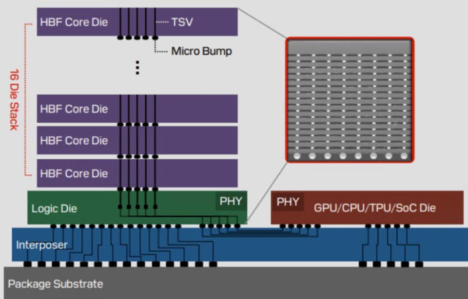 HBF借鉴了HBM的堆叠思路,将16层核心芯片堆叠并通过硅通孔互联,带宽可与HBM相匹配。