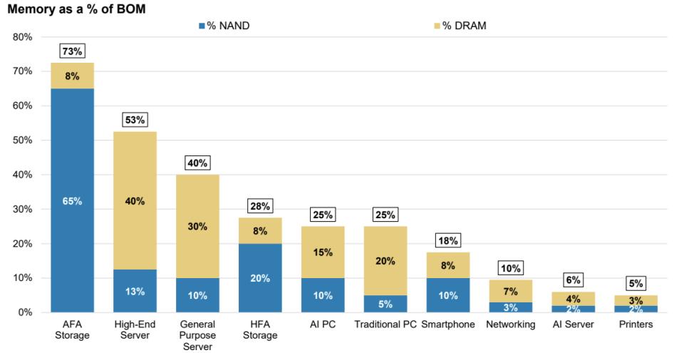 下图是大摩统计的“内存在硬件厂商成本中的占比”,其中All - Flash Array Storage(全闪存阵列存储)位居首位,占比73%。