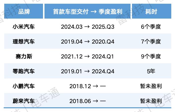 更重要的是,小米从首车交付到单季盈利,仅用了6个季度,比理想、蔚来、零跑等对手都快,成为新势力中“最快赚钱的车企”。