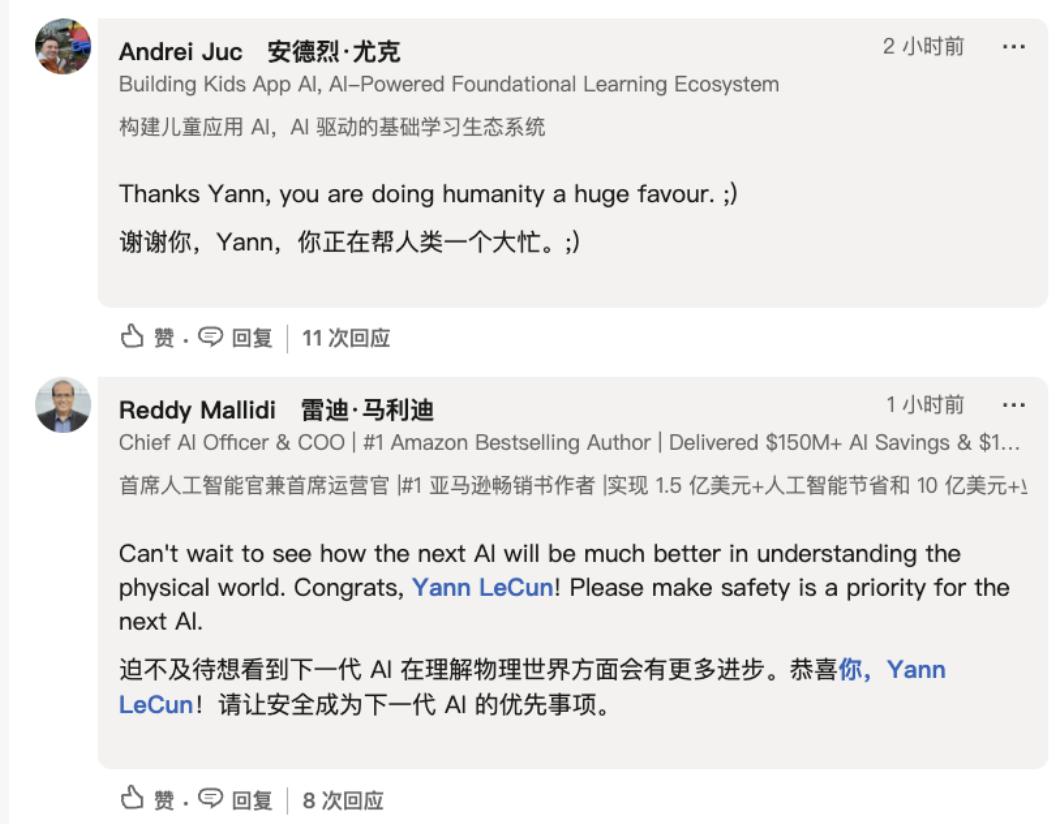 杨立昆官宣创业的帖子下方,网友对其新创业项目充满期待,有人称他正在帮人类大忙、迫不及待想看到下一代AI在理解物理世界方面会有更多进步。