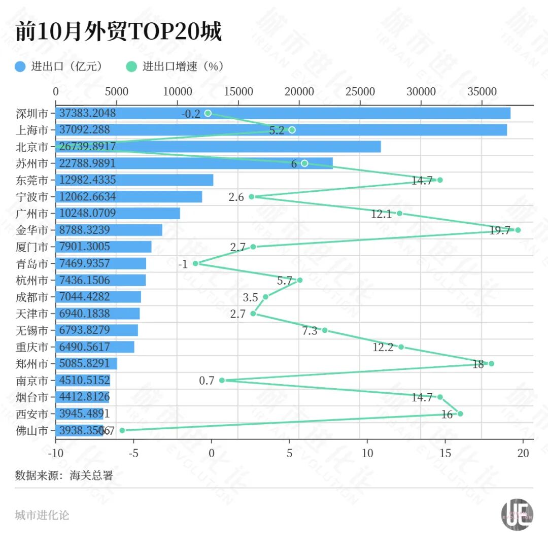 广州作为重要的经济城市,在今年前10月外贸成绩亮眼。据广州海关统计,广州市外贸进出口总值达1.02万亿元,创下历史同期新高,同比增长12.1%。其中,出口6823.6亿元,同比增长20.5%,增速居全国主要(前十)外贸城市首位、广东省21个地市首位。