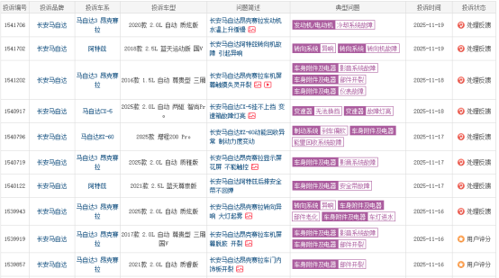 第三方汽车质量投诉平台显示,近半年针对长安马自达的投诉达270多条,主要问题包括冷却系统、转向系统、影音系统故障等。