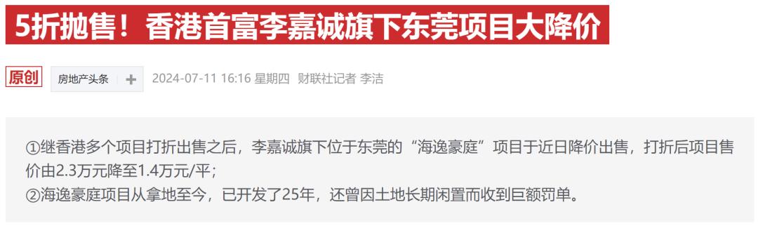 李嘉诚旗下的长实集团,近十年几乎持续抛售内地资产,对内地业务战略减持。去年更是开启“清仓式”甩卖,以低至40万元/套的价格抛售了大湾区四个城市的400套房源。
