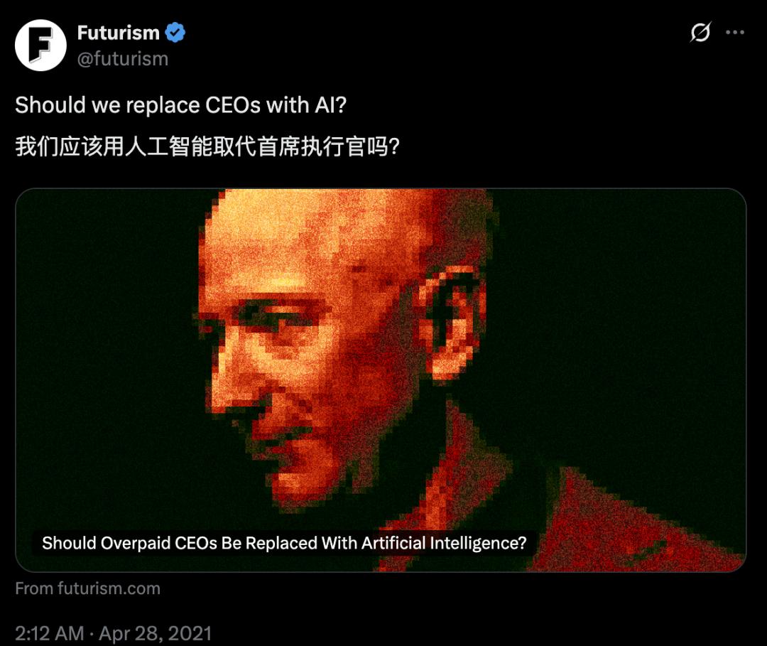 更别提马斯克那份炒得沸沸扬扬、规模接近1万亿美元的天价薪酬。与一些公司高层热衷于鼓吹用AI取代入门级和白领岗位相比,用AI取代CEO(高管),也许是一种更加立竿见影,同时也不会影响到公司持续发展的方案。实际上,关于是否可以用AI来替代CEO,在ChatGPT推出来的前两年,这个话题就曾被网友热议过。