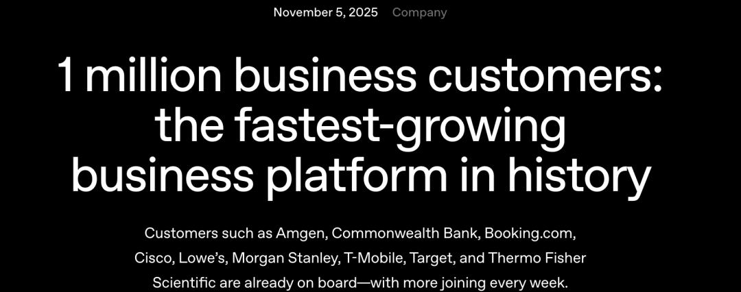 就在奥特曼提出「AI接班人」这一惊人构想不久,OpenAI在官网宣布:其「企业客户」已突破100万家,成为「历史上增长最快的商业平台」。客户包括联邦银行、思科、摩根士丹利等,而且每周客户数都在增长。