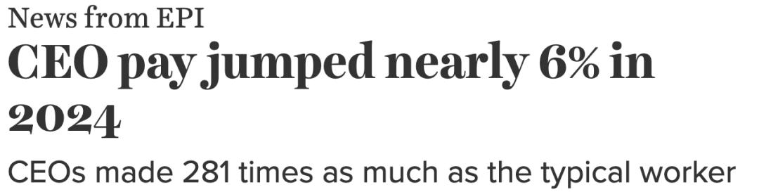 抛开奥特曼的退休计划,先看看AI取代人类CEO这件事靠不靠谱?从短期财务数字上看,这可能是笔划算的买卖。据EPI最新统计数据,2024年美国顶级上市公司CEO的薪酬是普通工人薪酬的281倍,过去几年这个数字一直在300倍左右。