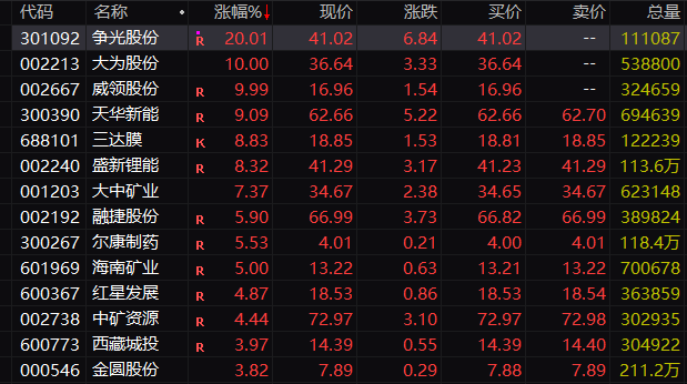 概念板块方面,锂矿概念板块表现亮眼,大幅上涨。具体来看,争光股份盘中“20cm”涨停,大为股份、威领股份盘中也封死涨停板,天华新能、三达膜等多股盘中涨幅一度超过10%,另有多股盘中涨幅超过5%。