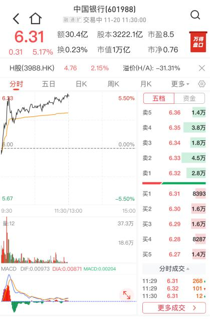 从板块表现来看,银行板块再度展现强势,中国银行、工商银行股价均续创历史新高。截至午盘,中国银行涨幅为5.17%,工商银行涨幅为1.58%。工行市值接近2.98万亿元,达29796亿元,中行市值为20332亿元。