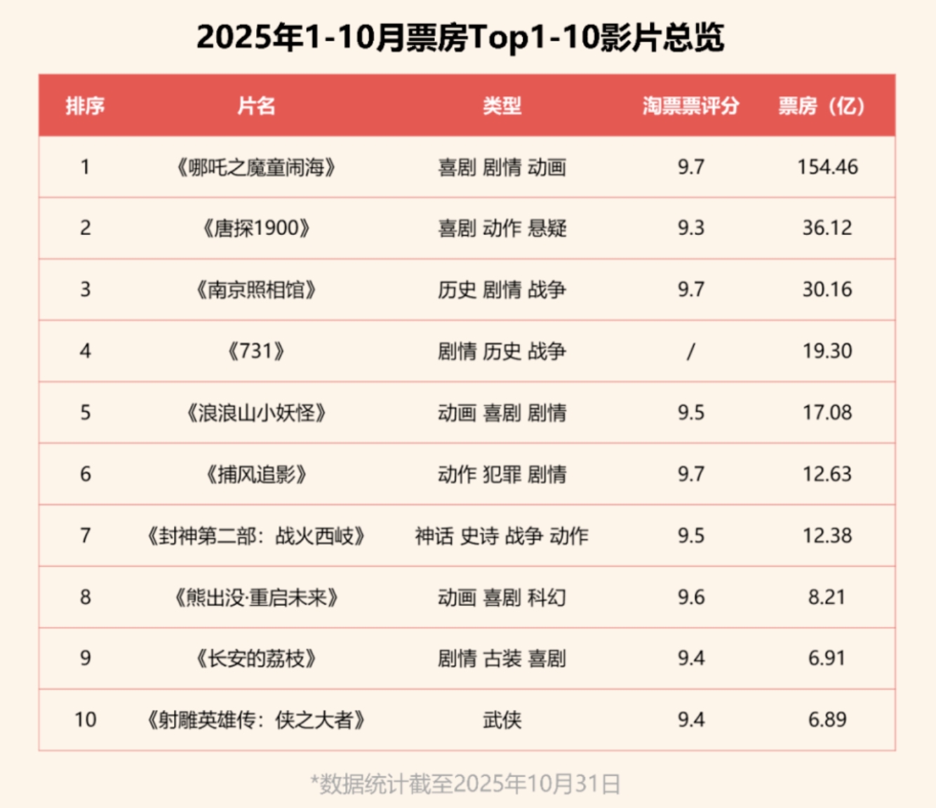 根据灯塔专业版统计,今年前10个月,《哪吒之魔童闹海》一部电影以154.46亿元撑起了将近1/3的总票房,远远超过排名第二的《唐探1900》。票房排名前十的电影中,只有7部票房超10亿,只有3部票房超20亿。倘若没有《哪吒》,今年的院线电影市场不堪设想。