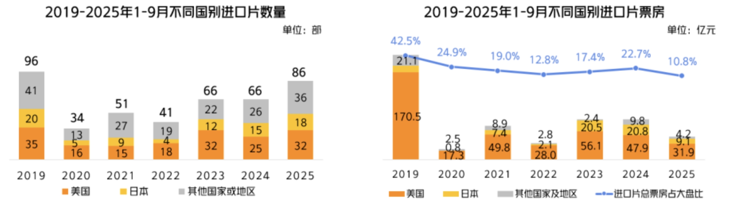 迪士尼全力押宝《疯狂动物城2》,也与好莱坞在中国市场的失势有关。过去几年,进口片在中国院线市场进入“增量不增收”阶段。2020 - 2022这三年,中国每年引入的美国进口片不足20部,今年为提振市场,虽加大引进力度至32部,但收效甚微。今年1 - 9月,美国进口片上映数量回升,但累计票房贡献下跌,其中仅《侏罗纪世界:重生》1部票房超过5亿。
