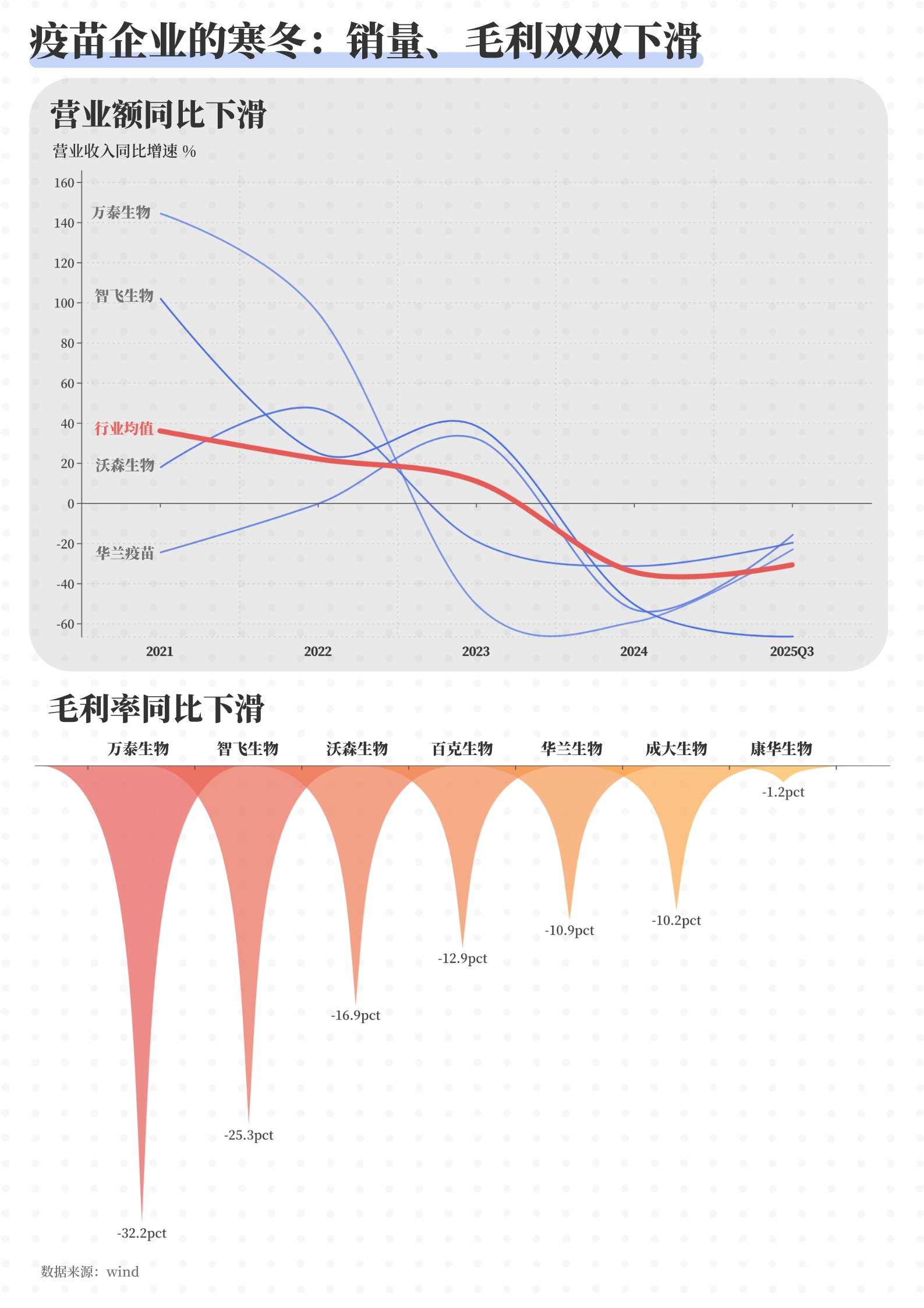 需求疲软和价格下降相互影响,企业的盈利能力持续受到压力。数据显示,七家头部疫苗企业净利率平均下降约46个百分点,其中三家企业已经出现亏损。