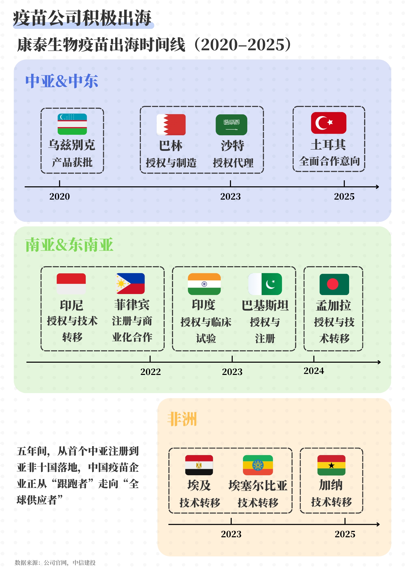 面对国内市场竞争的加剧,疫苗企业正在加快出海的步伐。以康泰生物为例,其23价肺炎疫苗在2020年于乌兹别克斯坦取得注册证书后,业务已经拓展到亚非多个国家,海外市场正成为新的增长动力。