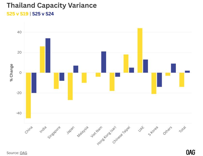 中国仍是泰国最大国际客源市场,2019年夏季中国大陆至泰国航线座位数达740万,但2025年夏季仅为410万,较2024年同期的510万减少100万个,较2019年同期下滑44%。显然,中国游客出行偏好的转移,直接导致相关航线收益承压。