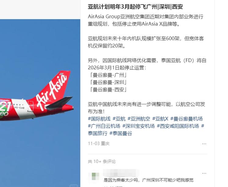 自2026年3月1日起,亚航集团旗下的泰国亚航将正式暂停执飞三条中泰航线,分别是广州 - 曼谷廊曼、深圳 - 曼谷廊曼、西安 - 曼谷廊曼。