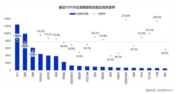 航班管家DAST数据显示,今年暑运中国赴泰航班量持续低迷,恢复率仅53.8%,而日本航线恢复率已超100%。