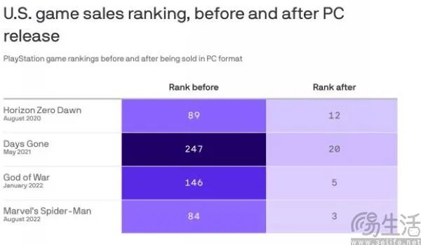 实际上,PlayStation游戏移植PC呈高开低走态势。起初,SIE打破“Only On PlayStation”为PC玩家带来新鲜感,吸引大批玩家购买。比如《战神》《往日不再》2022年登陆PC后收获大量新玩家,《战神》在美国销量排名从第146跃升至第5名,《往日不再》从247名升至第20名。