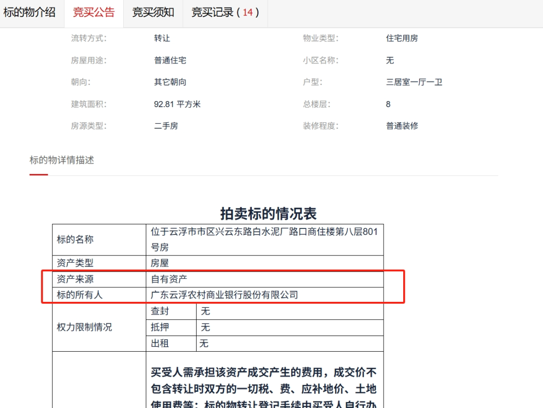 广东云浮农村商业银行股份有限公司拍卖标的情况表更清晰,资产来源为自有资产,标的所有人为银行。