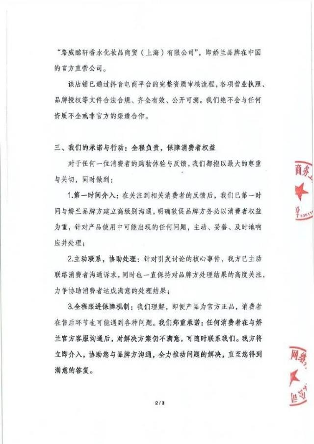 11月18日晚,贾乃亮工作室发布情况说明称,经与抖音平台及娇兰品牌方共同确认,直播间所售产品均为核心官方商品,由官方旗舰店发货,物流链路由品牌官方负责,保证了货源渠道的统一、规范以及产品的官方正品属性。在得知消费者反馈后,第一时间与品牌方进行了高级别沟通,已主动联系消费者了解诉求,会全力推动问题解决。
